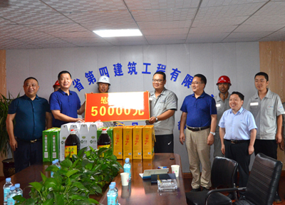 8月5日,河北省省直工会副主任马永红、办公室主任马涛,冒雨到四分公司石钢项目部进行暑期慰问,为项目职工送上五谷杂粮、食用油等物品及慰问金。省四建公司党委书记、董事长董富强,党委副书记、工会主席李怀生一同参加。